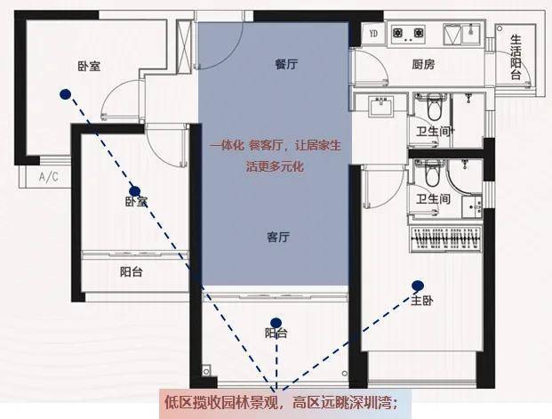 阳台阔绰:前海稀缺在售89㎡三房两卫三阳台,客厅阳台进深1.9米,揽收城园双景