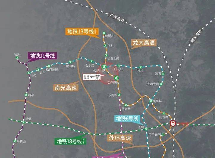地铁配套:深业云筑2期距离在建的13号地铁线二期“公明广场站”距离1.1公里,“新庄站”(以前的公明南站)距离800米左右,另外深业云筑2期规划有公交首末站,可以快速接驳地铁站;现有的6号地铁线“公明广场站”距离有1.6公里,步行需要24分钟。