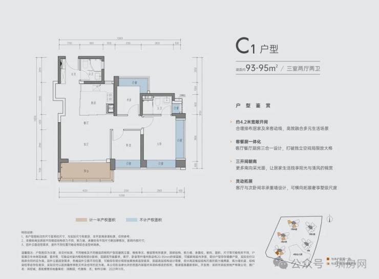 C-1户型 | 建面约93-95㎡三室两厅两卫