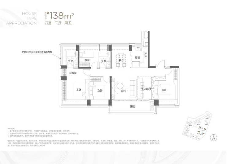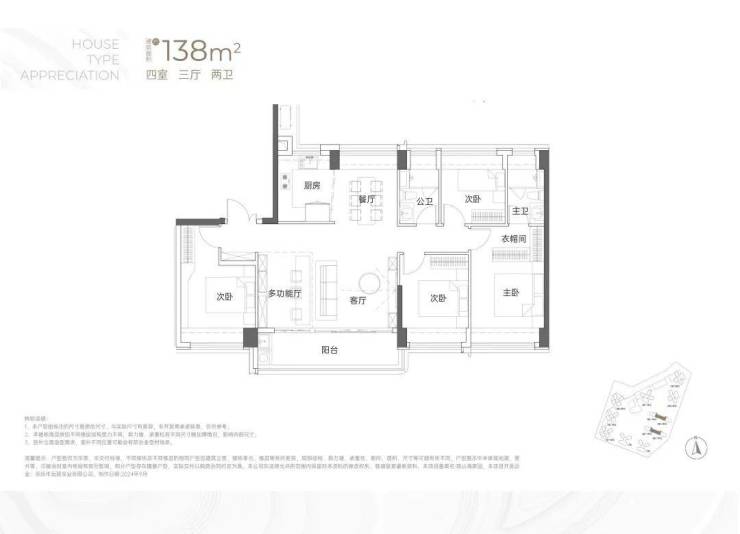 竖庭格局,西南向,基本居住功能与建面约108-110㎡4房2卫一致,但格局不一样,从目前公布的户型图上看,主要是主卧空间有了更大的提升,比如可以放更大一点的衣柜。但从位置上看,它所在的楼栋更靠近主干道,会有噪音影响。