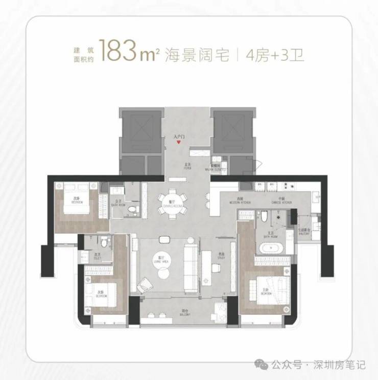 T9/T10栋:总高53层,4梯3户,183-270㎡4房及270㎡复式。
