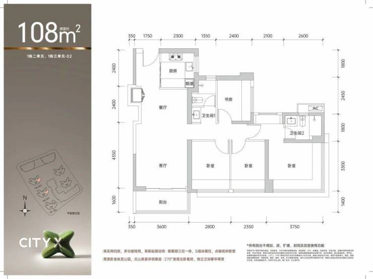 建面约108㎡4房2卫,是陪伴三代同堂/多孩家庭成长的户型。