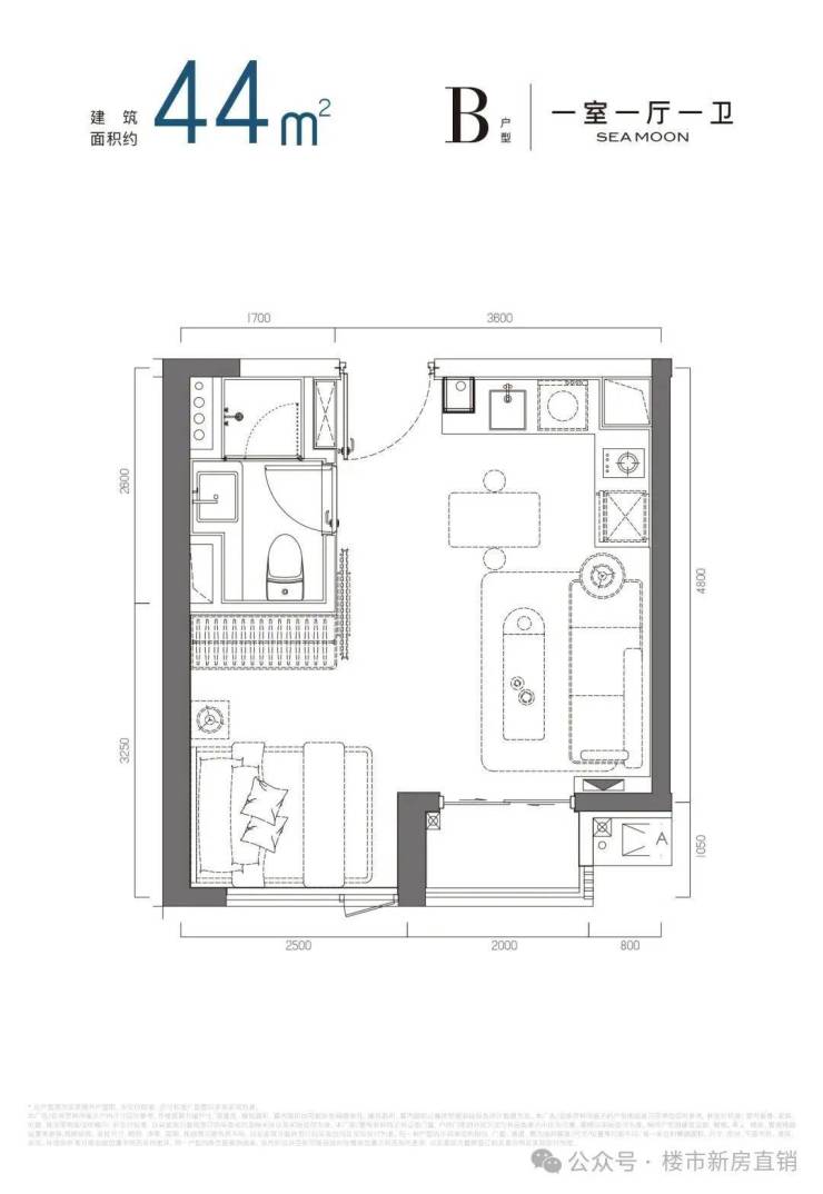 该户型为一房一厅布局,虽为44平,但每一寸空间都利用得非常到位,“五脏俱全”的同时,日常活动区域也不拥挤。
