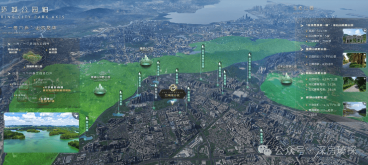 在产业澎湃的另一面,是一条横贯城市的生态中轴。银湖山、塘朗山双脉如屏,民治、民乐、雅宝、南坑四水环绕,超核“未来之眸”绿芯公园、民治体育公园、红木山郊野公园等九大公园环伺左右。