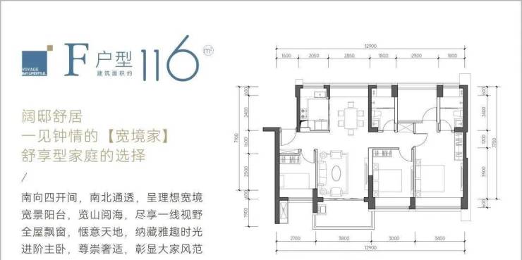 116㎡的4房2厅2卫F户型,同样为竖厅南北通透,餐客厅一体化,客厅开间3.8米,四开间朝南。卧室面积分别为主卧18.02㎡、次卧12.3㎡、次卧8.7㎡和次卧8.37㎡(含墙体飘窗),无需飘窗设计床铺。配备L型厨房,卫生间干湿分离,得房率约88%(含赠送),阳台主要朝向西南或东南。