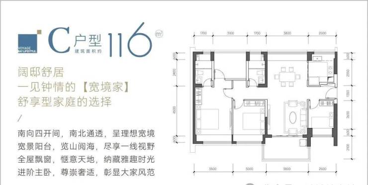 116㎡的4房2厅2卫C户型,竖厅南北通透,餐客厅一体化,客厅开间3.8米,四开间朝南。卧室面积分别为主卧17.85㎡、次卧11.4㎡、次卧9.3㎡和次卧8㎡(含墙体飘窗),均不依赖飘窗设计床铺。U型厨房,卫生间干湿分离,得房率约93.13%(含赠送),阳台主要朝向西南、东南或正南。