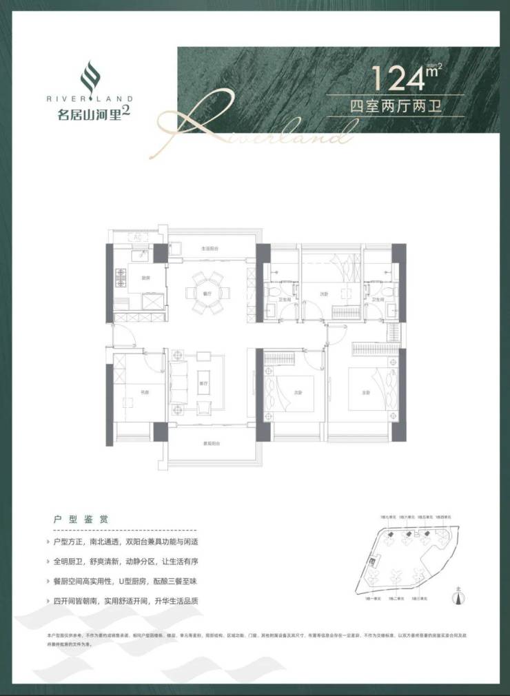 124㎡的4房2厅2卫,设计的是竖厅南北通透格局,进门入户玄关,客厅3.9米开间,四开间朝南,客餐厅双阳台通透设计,U型厨房,卫生间干湿分离,得房率:73.86%(不含赠送),阳台主朝东南向。