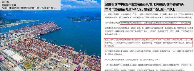 盐田拥有全球效益最好集装箱码头-盐田港。盐田港承担全省超三分之一外贸进出口,全国对美贸易四分之一货量,直接带动约百万人就业,间接带动千万人就业。