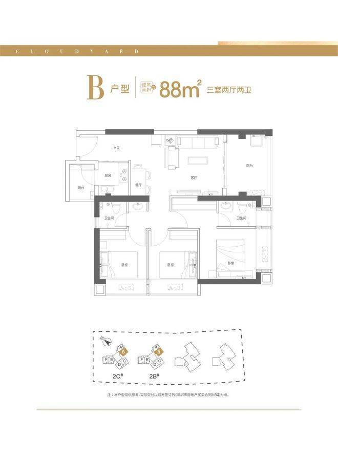 建面约88㎡三室两厅两卫