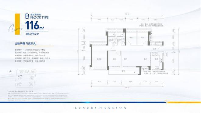 横厅格局,利用率高;餐客一体约6.5米长大阳台,卫生间干湿分离设计;05东南、06西南朝向。