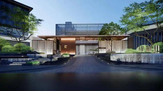 小区是往现代高端社区方向打造,步行大门是山林水石设计,而车行出入口则设计了酒店级回旋处落客区,跟「胤璞」很像。