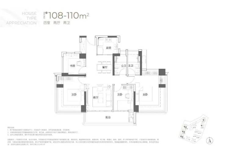 竖庭格局,西南向,基本居住功能与建面约108-110㎡4房2卫一致,但格局不一样,从目前公布的户型图上看,主要是主卧空间有了更大的提升,比如可以放更大一点的衣柜。