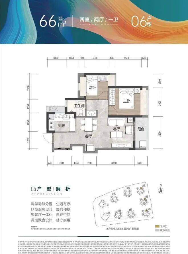 建面约66㎡,2房1厅1卫