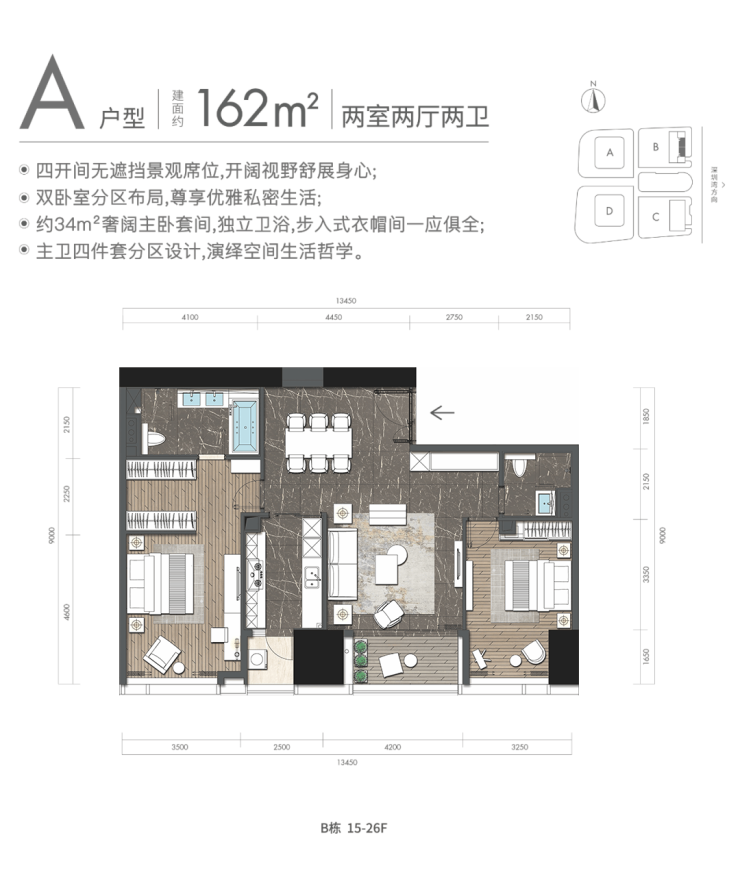 A户型:约162㎡2房2厅2卫:B栋15-26F(中区),东朝向