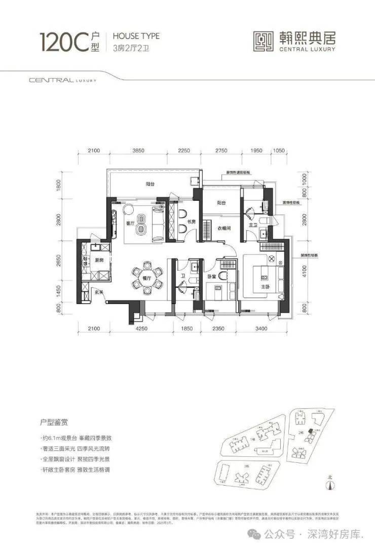 105-120㎡三房:竖厅或双龙抱珠格局,6.5米阳台,得房率约90%,折后总价894万起。