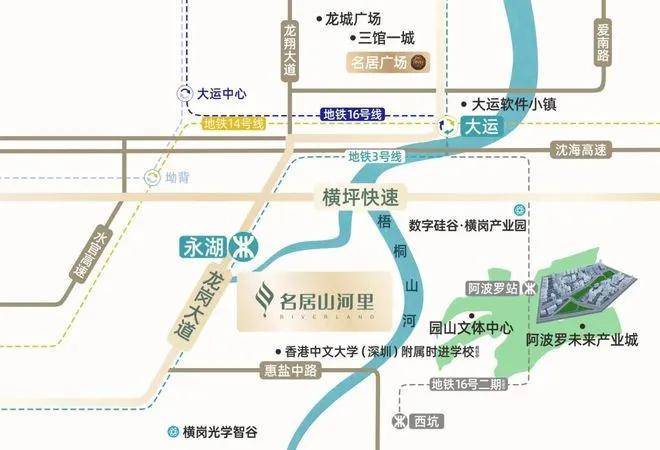 “三地铁”自由出行3号线:约200m即永湖地铁口,两站到大运,8站到罗湖14号线:两站达大运,7站抵达布吉,10站即达岗厦北16号线:一站达大运中心,速联园山街道,抵达阿波罗未来产业园。
