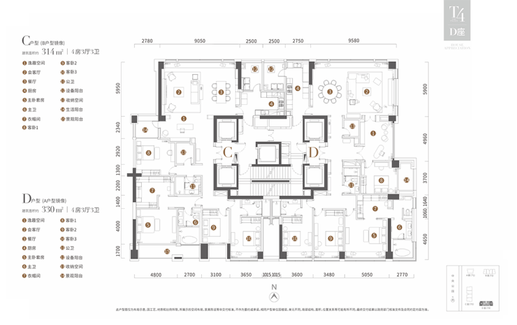 T4栋为314平和330平4房3厅3卫户型。330平户型动静分区,独立入户玄关。57平餐厨空间,奢华感十足。近60平主卧,空间阔绰,设有独立衣帽间。一次卧有景观阳台,景观视野好。314平户型将观景阳台设在主卧,主卧功能布局完备。两个户型餐、厨、客厅连成一线,动线合理。