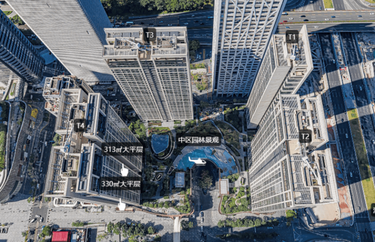 项目目前主要在售的是T3、T4公寓产品,建面约266-330平。两栋相较之下,T3栋的景观视野更好,客厅直面市民中心南广场的绿地。整体采用高档品质、空间开阔、舒适度高。