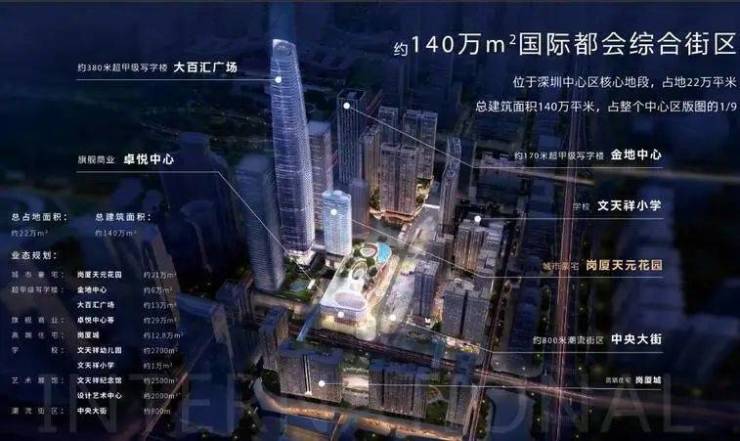 深圳中心天元项目占地面积约22.3万㎡,总建筑面积约140万㎡。规划有约21万平住宅及公寓、约17万平2栋甲级写字楼、约29万平商业。高端商业—“One Avenue卓悦中心”、170米高的写字楼—高金地中心,目前都已投入使用。
