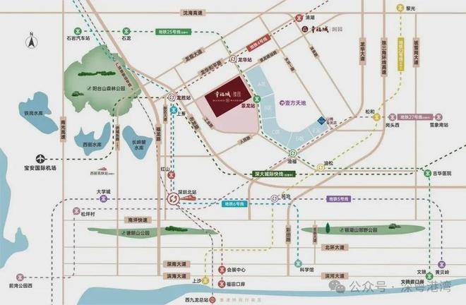 幸福城I臻园直线距离地铁4号线龙华站约400米、直线距离地铁25号线景龙站(在建中,预计2028年开通)约200米,多地铁和城市快线环伺,未来可速达机场、前海、福田中心区,即是繁华的出发地,也是繁华的目的地。
