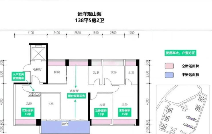 小区总共规划了870户,均为商品房,无回迁、保障房等,车位配比987个,梯户比2T4户、2T5户、2T2户都有。推售面积95㎡3房、108-110㎡4房、113-115㎡4房以及138㎡4房。