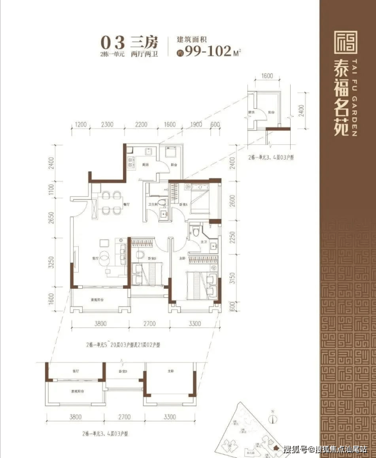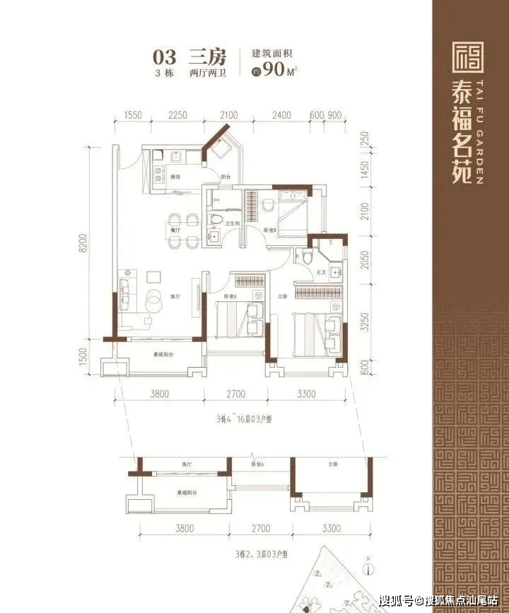 90-102㎡的3房2厅2卫户型。这几个户型都是在主人房多设计一个卫生间,私密性更强,也让家人间的生活更加方便。