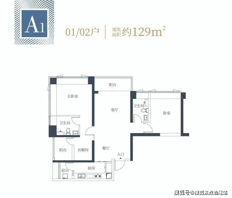A1户型约129㎡2+1房两卫(1栋1/2单元01/02户型)竖厅格局,餐客一体设计,需要靠封阳台获取+1房,西北朝向。