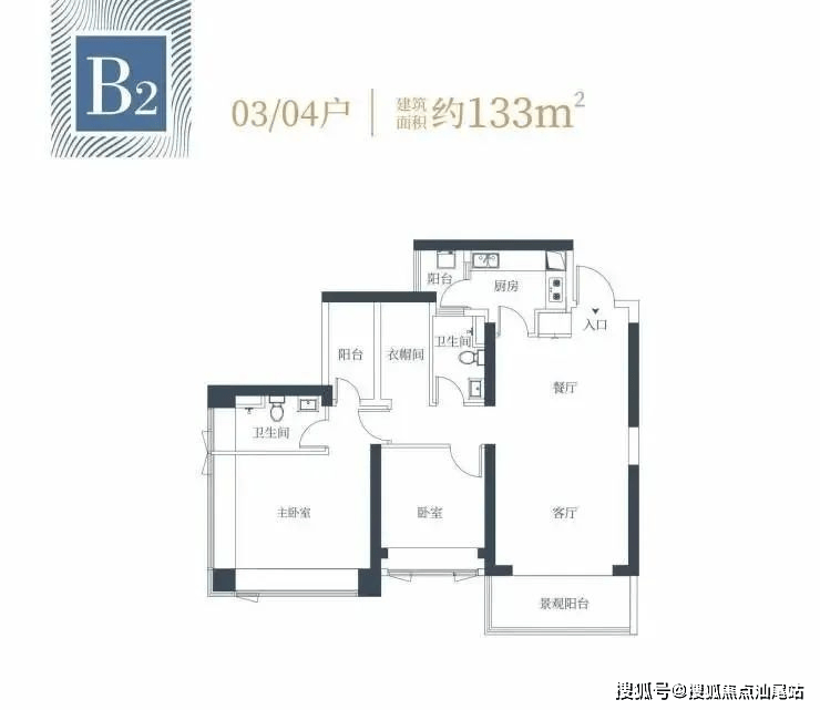 B2户型约133㎡2+1房两卫(1栋2单元03/04户型)经典竖厅格局,餐客一体设计,需要靠封阳台获取+1房,西南朝向,看向在建的赤湾朗玥佳园,能看到伶仃洋海景。