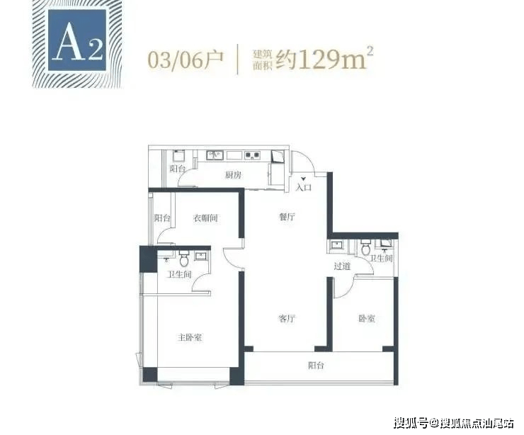 A2户型约129㎡2+1房两卫(1栋1/2单元03/06户型)竖厅格局,餐客一体设计,相比A1户型,阳台更大,连通次卧,其中公卫是暗卫,空气流通性差;需要靠封阳台获取+1房;东南朝向,看向小区内部和南开大厦。