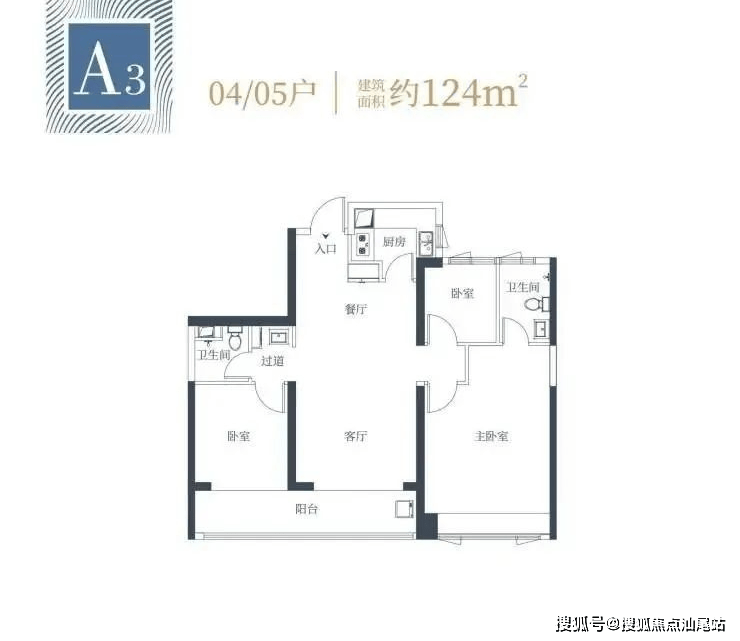 A3户型约124㎡三房两卫(1栋1单元04/05户型)双龙抱珠格局,餐客一体,客厅开间约4米,约7米阳台连接次卧,但公卫是暗卫,空气流通性差,加上卫生间对着消防天桥,隐私性差;东南朝向,看向小区内部和南开大厦。