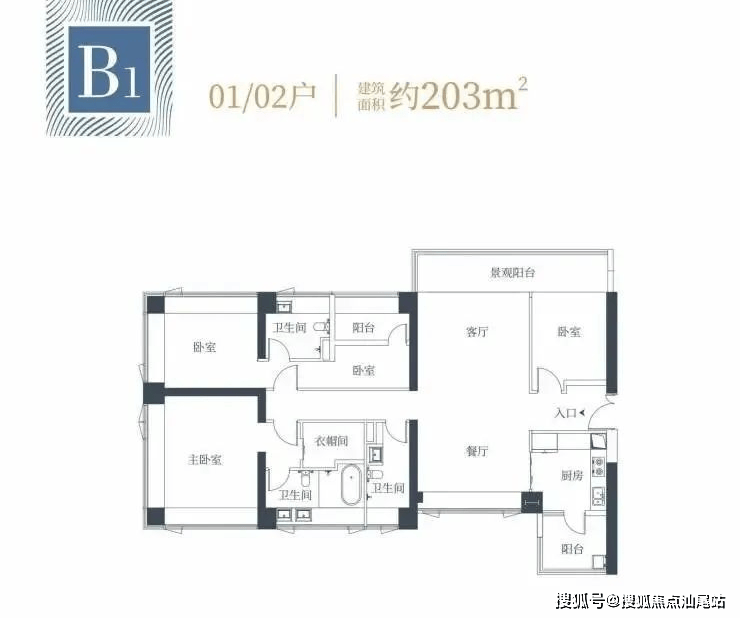 B1户型约203㎡3+1房两卫(1栋2单元01/02户型)竖厅双龙抱珠格局,餐客一体,阳台连通次卧,同时满足生活和观景两个功能;需要靠封阳台获取+1房,阳台东北朝向,距离大南山公园很近,视野景观不错
