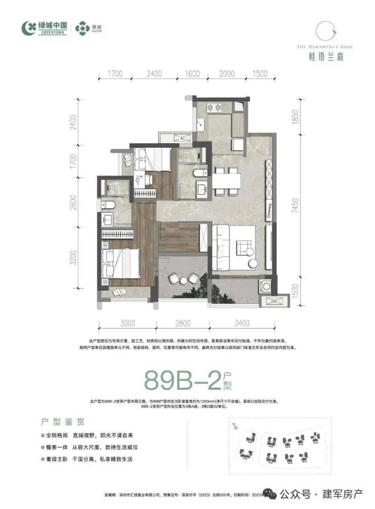 89㎡的3房2厅2卫(一期A-2户型),3栋B/C座01.02户型,设计的是经典竖厅格局,客厅3.4米开间,LDKB一体化设计,三开间朝南,动静分区,分别做到了主卧12.7㎡/次卧10.92㎡/次卧7.5㎡(包含墙体飘窗),U型厨房,卫生间干湿分离,得房率:75.2%(不含赠送),客厅约5㎡西南朝向。套内面积66.85㎡+赠送面积8.54㎡=实用面积75.39㎡,加上赠送后得房率约84.78%。