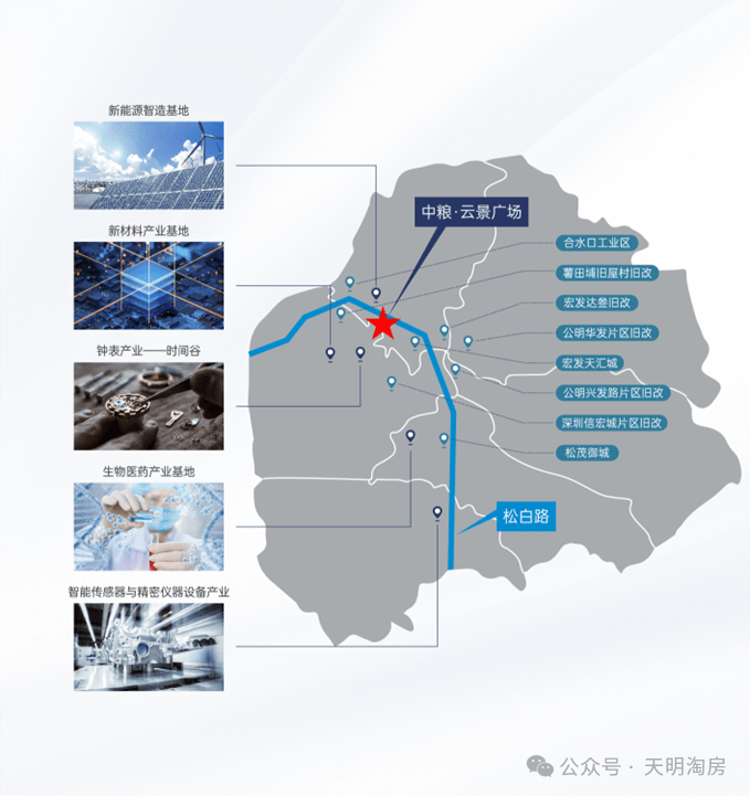 3、国家低碳生态建设试点:生态控制线占新区总面积53%,拥有6000多公顷生态旅游景区,绿地覆盖率占土地总面积的53%;4、项目紧邻光明核心主干道——松白路,作为光明的经济发展主轴,松白路以“1+3+N”功能布局,打造三大功能区段,聚集起大量战略性高新产业,逐渐形成一条高新产业带。其中马田街道以建设市级先进制造业园区为重要契机,规划与建设新能源智造基地、新材料、生物医药、钟表、智能传感与精密仪器设备等产业集群。