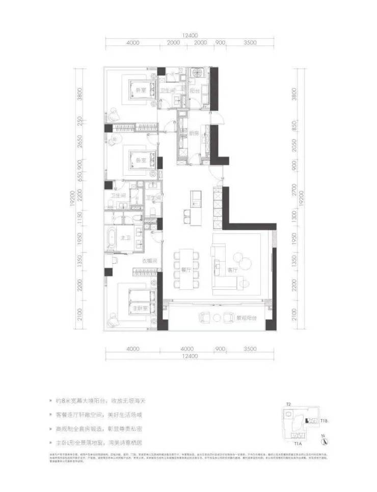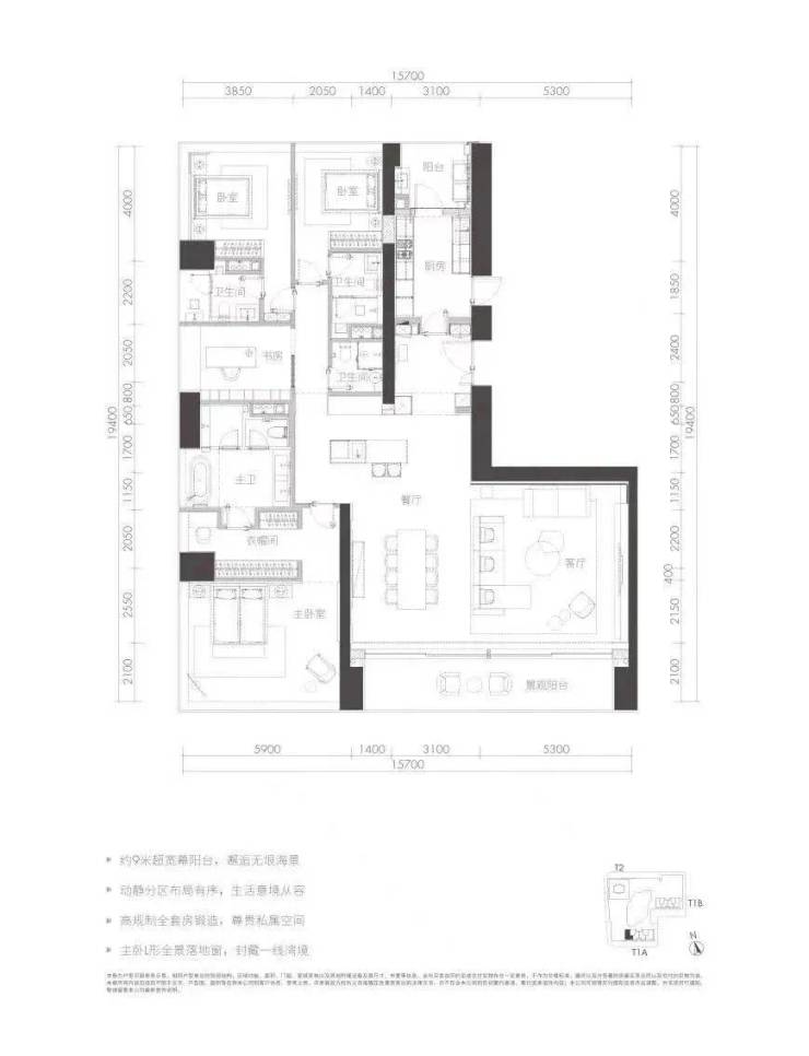 T1B栋B/C户型与T1A栋B/C户型如同双胞胎,只是在面积上稍有微小的差异。虽然其地理位置相较于T1A栋稍显不足,但仍然可以欣赏到迷人的海景。个人觉得C户型的位置要优于B户型,因为它拥有更广阔的视野,无论是南面的海景还是北面的湾景都一览无余。