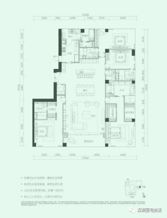 采用了独特的四套间设计,还配备了工人房,为主仆提供了宽敞的空间。主佣分区,使得生活更加便利。客厅采用竖厅布局,约12米双厅进深,空间利用率超级高。而且,这栋住宅位于东端头位置,拥有270°无遮挡的开阔景观,每个卧室都可以欣赏到美景。此外,它只存在于T1B栋的33-38层,只有6套,是真正的稀有住宅。
