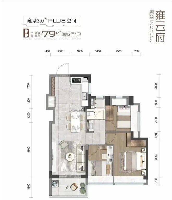 79㎡的3房2厅1卫,设计的是竖厅格局,客餐厅一体化,客厅3.2米开间,S墙设计预留冰箱位,3个卧室分别是3/2.4/2.3米的宽度,L型厨房,卫生间三段式分离设计,,西南或东南朝向。