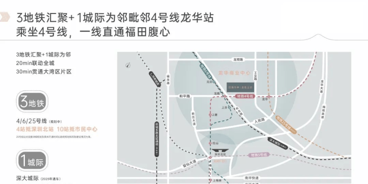 项目1.5公里范围内分布有布龙路、和平路、龙观大道、福龙路等主干道,加上龙华本身地处深圳中轴,理论上对外自驾通勤是比较方便的