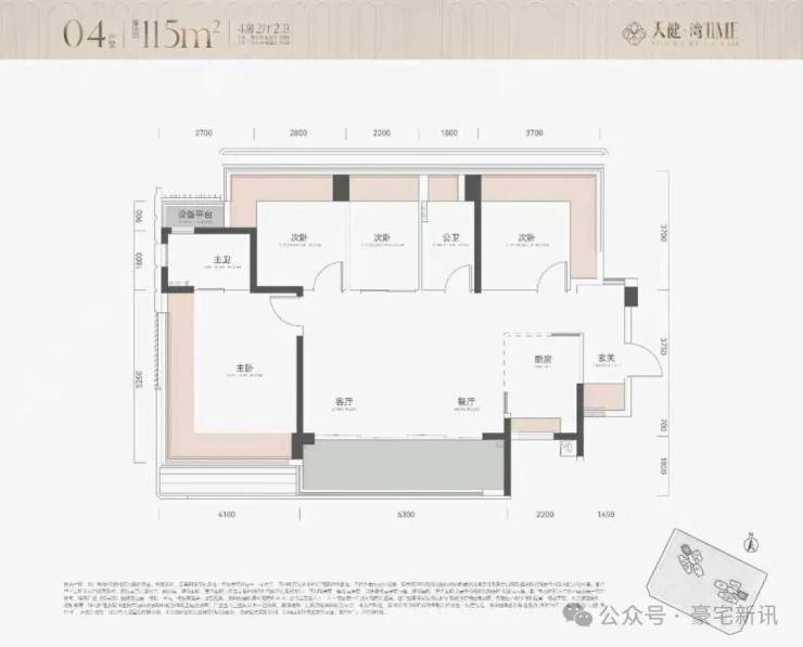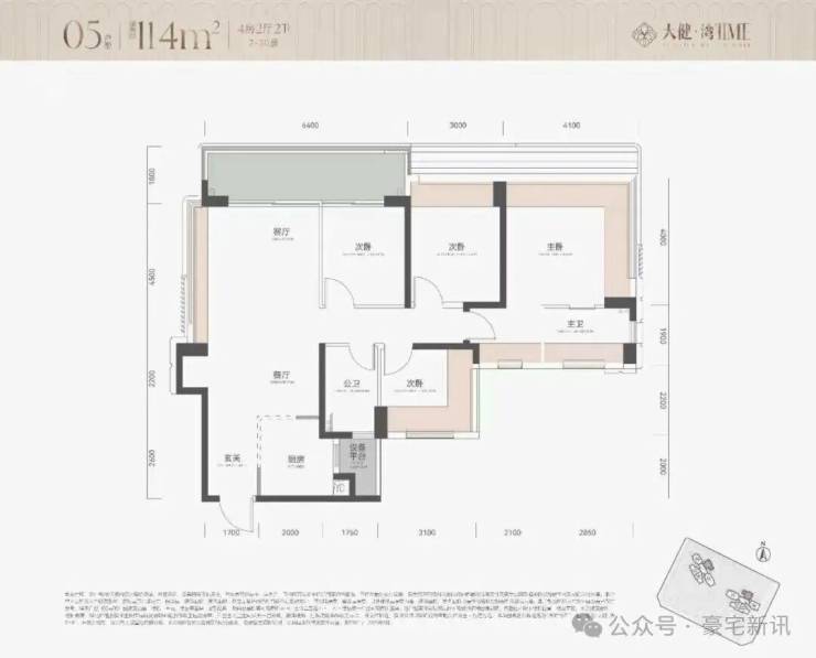 这个就是05的户型图,114平4房,传统动静分离竖厅户型,厅出大阳台,延伸到次卧,主卧和其中一个次卧双面飘窗采光,加上厨房外的设备平台,赠送面积大。