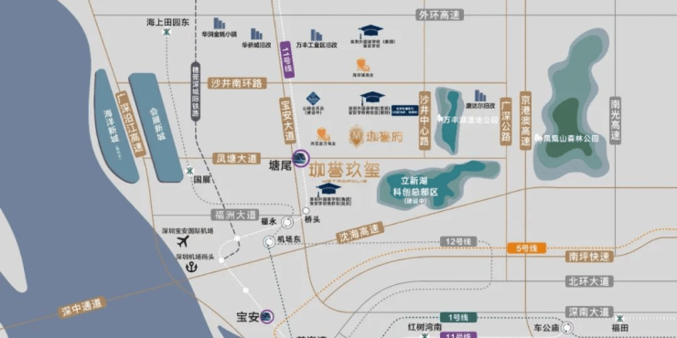 项目位于沙井塘尾地铁站旁,航母级综合体含「湾区壹方」商业、总部办公、高端酒店、商品房住宅、保障房,各方面配套都非常丰富。
