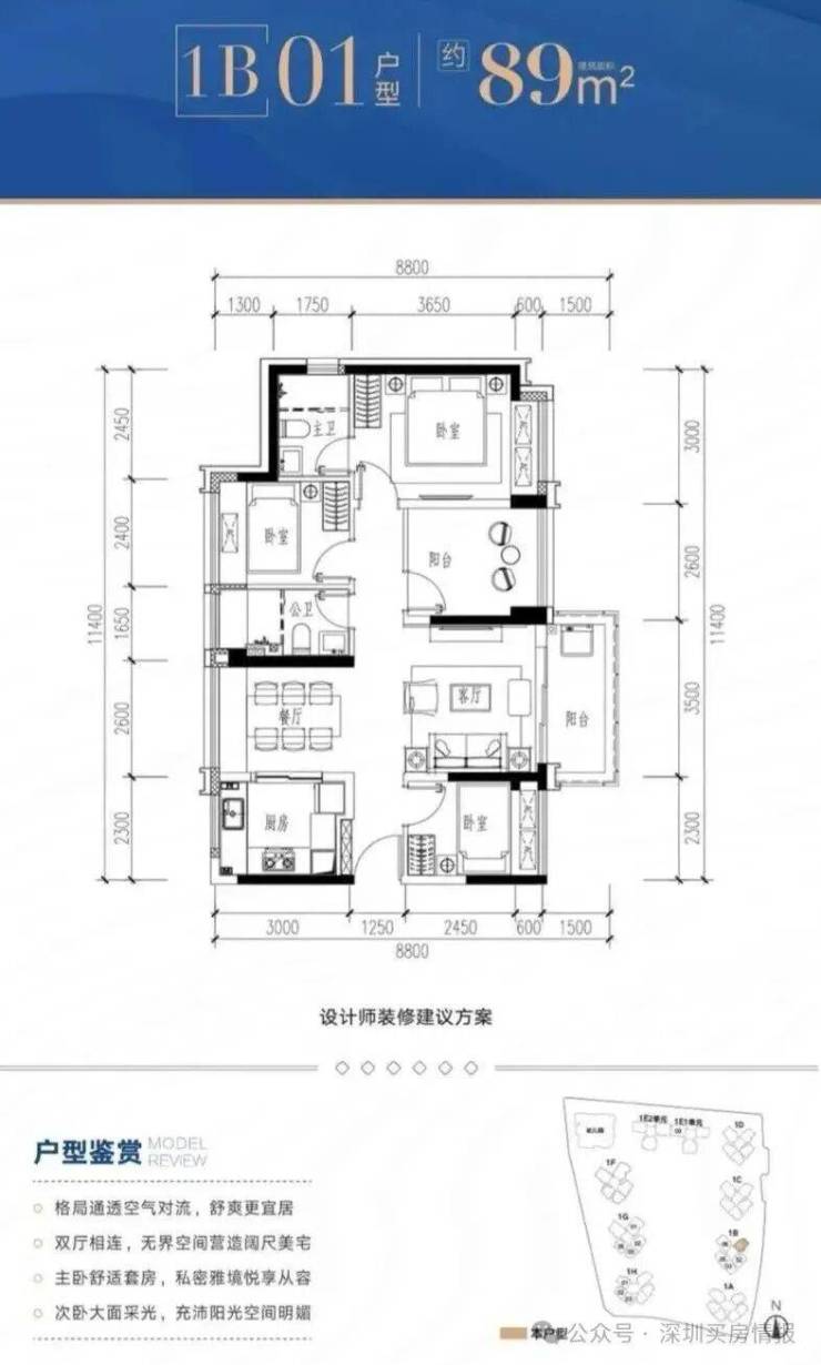 1B-01户型:约89㎡ 四房两厅两卫: