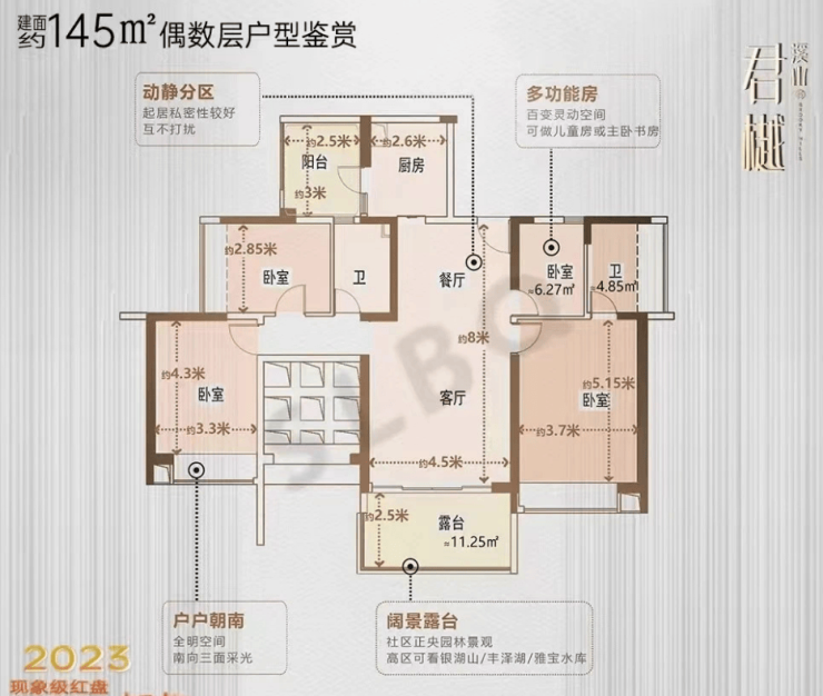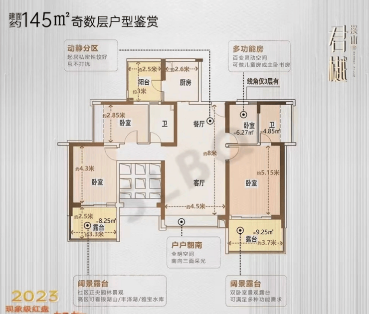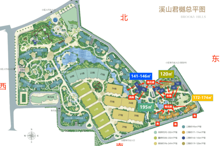120㎡3+1房2卫 客厅朝南 南北通 141-146㎡4房2卫 溪山君樾140平的户型可以收获170平的空间体验面积171-173㎡4+1房2卫 170平户型可以收获200平的空间体验,不光房间大,还房间多。195㎡4+1房2卫