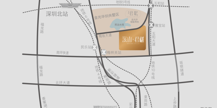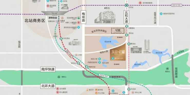 【立体枢纽加速度·让大人物从容转瞬圳央】“湾区级交通网格”:近拥深圳北站—五和双枢纽,一小时大湾区各城从容出行,畅达全国“地铁网格黄金交叉点”:深圳地铁10号线雅宝站,可快速切换8条地铁线,1站速达福田,将时间留给都市沉浸享受。“南坪快速连通道”:项目东侧快速接驳干道直连南坪快速,专享无阻碍快速路,接驳南坪通达全城。