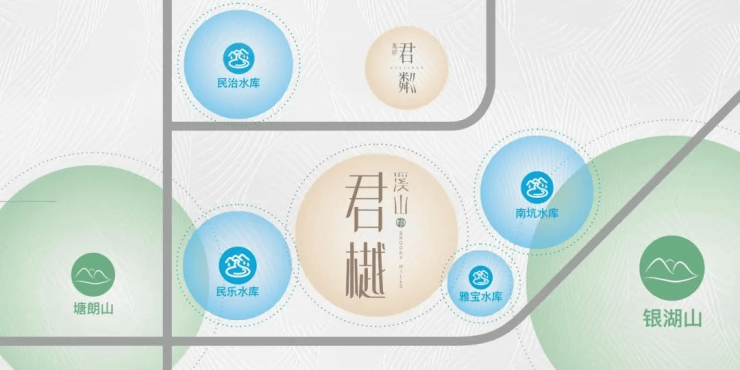 休闲•生态【宽怀壮阔·无价湖山】比肩世界湖区的优越资源:溪山君樾位处深圳“中心湖区“,是深圳最稠密的湖区所在地,项目周边环伺4大自然生态湖泊---民治水库、民乐水库、雅宝水库、南坑水库,居住在此,湖岸微澜风光无限,滋养健康涵养心境,孕育都会生活于家族贵雅之道;