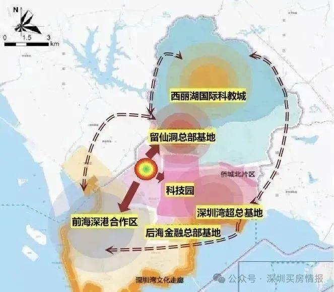 『1枢纽』:距离西丽高铁枢纽(在建中)约2.3km,其规划“高铁西丽站、城际西丽站”、“4高铁+2城际+4地铁”,规模超深圳北站