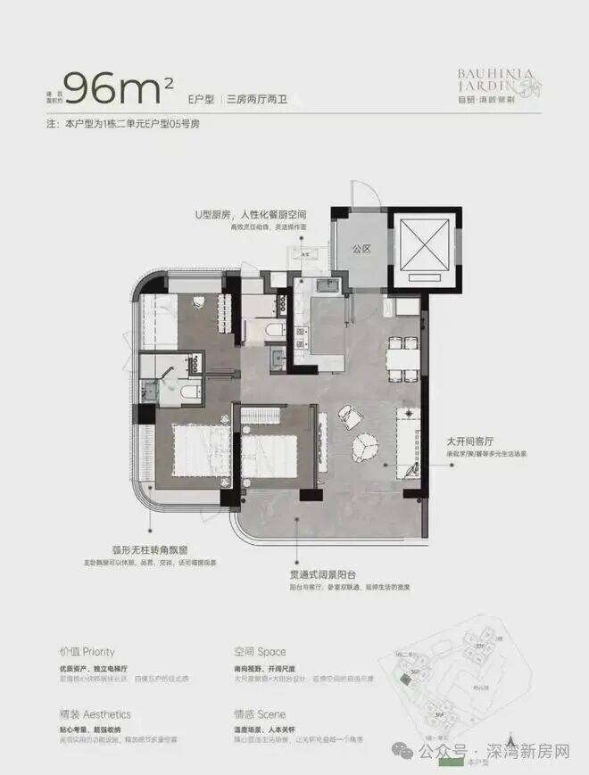 从空间布局来看,U 型厨房的设计极为人性化,大开间客厅与宽阳台是整个户型的最大亮点,西南向视野使得整个户型采光充足,贯通式阔景阳台与客厅、卧室双通,极大地拓展了生活空间的宽度。主卧的飘窗台也是一大亮点,弧形无柱转角飘窗不仅提供了广阔的视野,还增加了室内的采光。