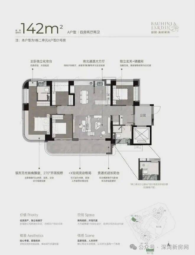 湾啟紫荆位于前海妈湾听海大道,占地约1.5万㎡,住宅建面约6.6万㎡,容积率5.14,共有三栋住宅组成,层高36-37F,共485户,车位595个,车位比1.1.2,4梯5户,主推约96㎡稀缺三房、111㎡3+1房、122㎡四房、142㎡四房。户型设计了大客厅、宽景阳台、阔景飘窗等,拥有山海河多重景观资源,计划品质精装交付。户型采用建筑新规设计,户户大阳台,4梯5户,分布式电梯设计,独立电梯厅。