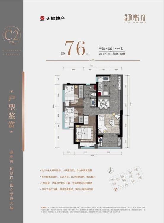 户型面积:75-76-89-99m²(3房1-2卫)
