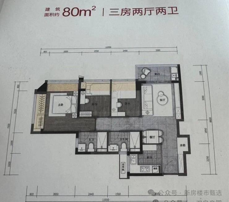 建筑面积约80㎡户型(竖厅)-3房2卫