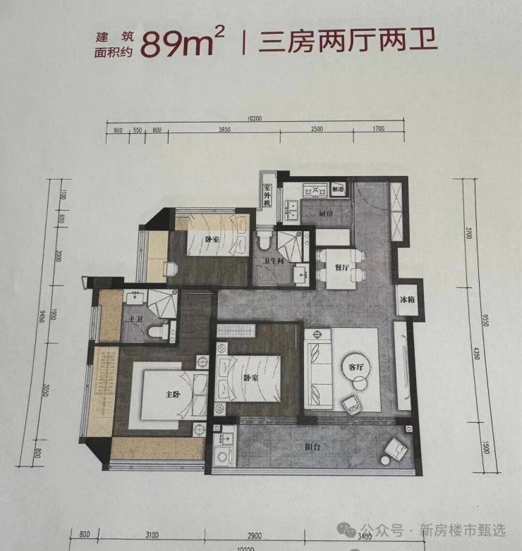 建筑面积约89㎡户型-3房2卫(竖厅)