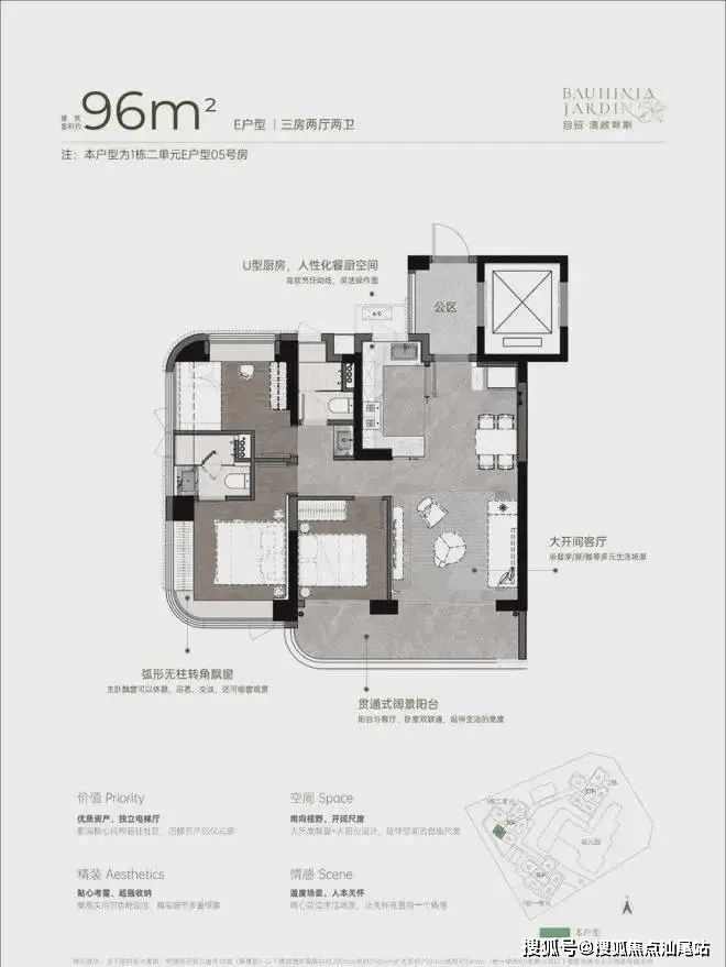 U 型厨房的设计极为人性化,大开间客厅与宽阳台,西南向视野,采光充足;主次卧两面飘窗,弧形无柱转角飘窗最大化提供了广阔的视野。